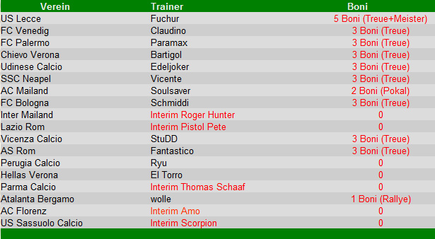 Ansonsten gab es diesmal ein regelrechtes Trainerbeben zur neuen Saison. Alle drei Abstiegstrainer (Giovanni Trapattoni, Esali Masi und Scorpion) haben die Liga als Manager verlassen! 🙁 Wobei uns Scorpion (ist als Manager nach Leverkusen gewechselt) zumindest noch als Interim vorerst erhalten bleibt, während die anderen beiden Manager sich in den Ruhestand begeben haben. Neu in der Liga begrüßen wir dafür Manager Soulsaver (Rückkehr aus Zoccer-Ruhestand) und Interim Amo (Manager in Spanien). Außerdem ist noch Manager Wolle zu seiner „alten Liebe“ zurückgewechselt. Wer jetzt genau wo spielt, seht ihr in der Tabelle unten.